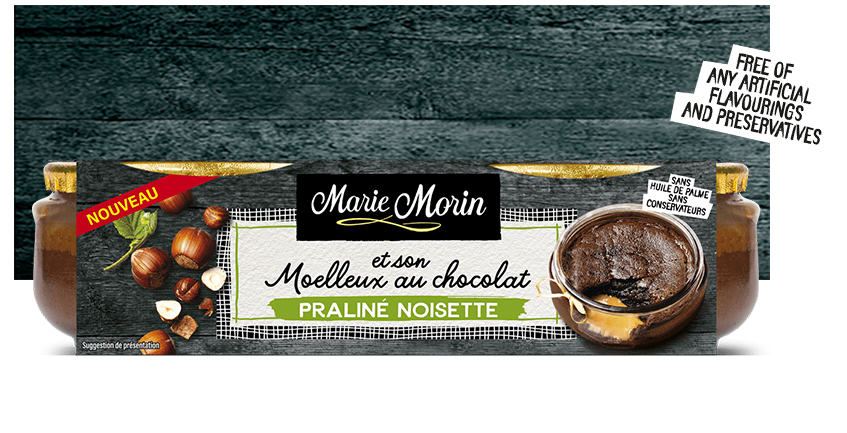 Marie Morin’s Moist chocolate cake with hazelnut praline is a rich, melt-in-the-mouth dessert that combines dark chocolate made with 100% pure cocoa butter and smooth hazelnut praline. Its soft texture hides a luscious, gooey center.