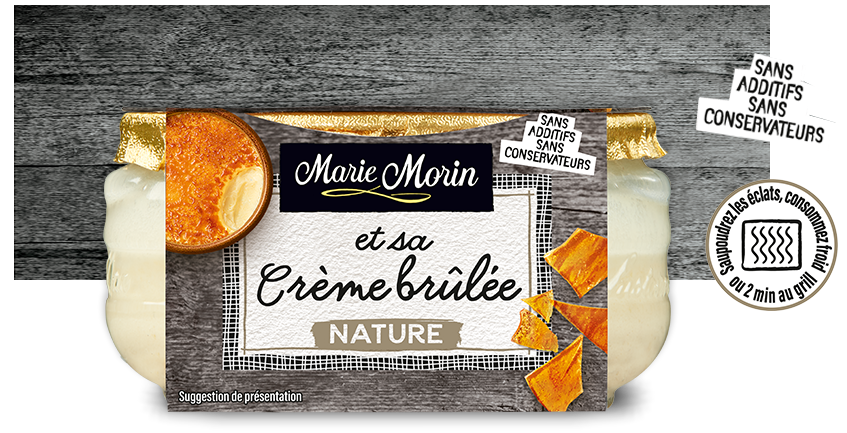 Réaliser la mousse de crème brûlée : à l’aide d’un chalumeau, caraméliser le sucre sur les crèmes brûlées Marie Morin. Vider les pots dans un fait-tout, mélanger et mixer l’ensemble à l’aide d’un mixeur plongeant.